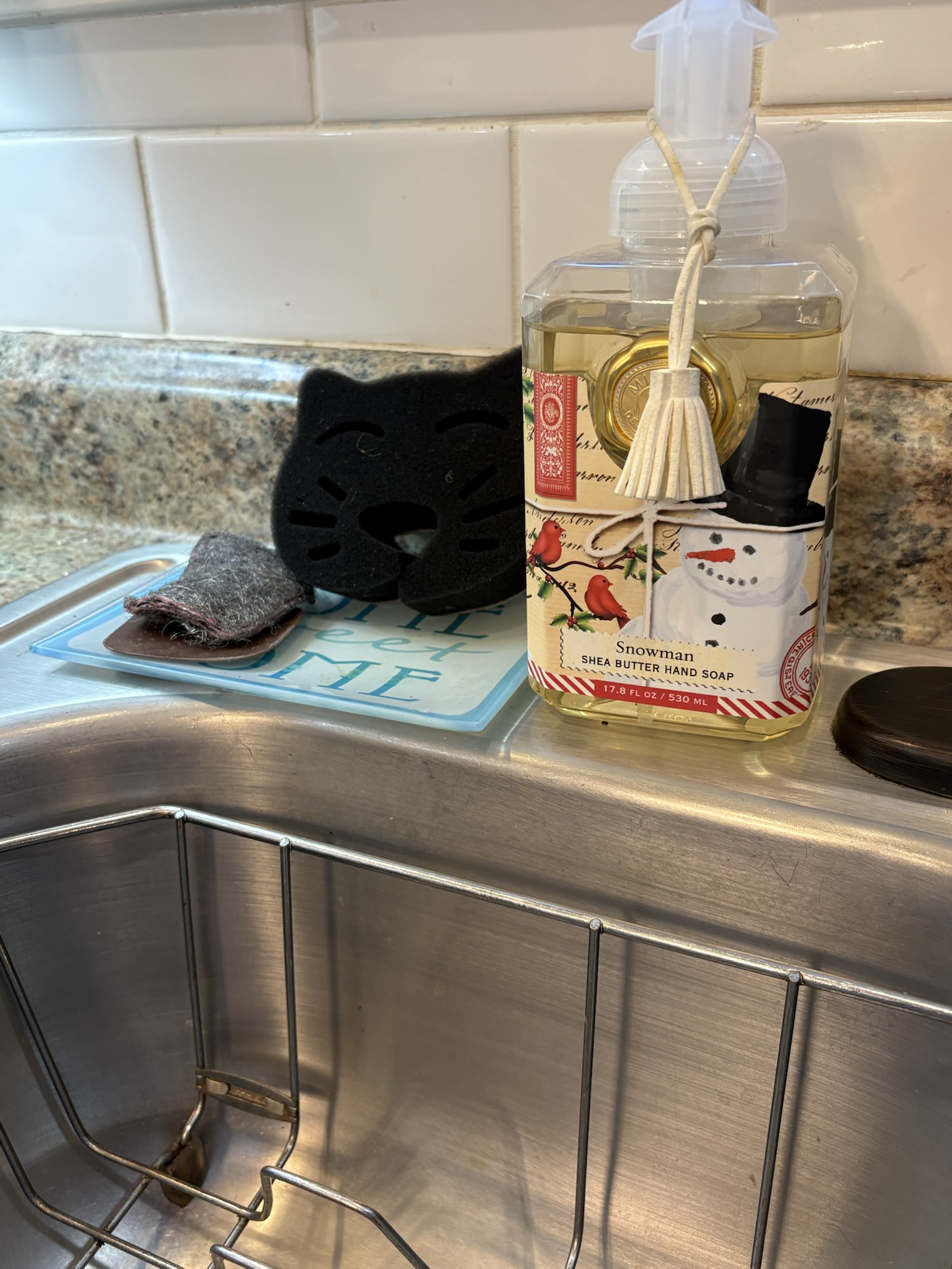 My sink has a little dish that holds a Brillo pad, and scraper and a cute kitty sponge.