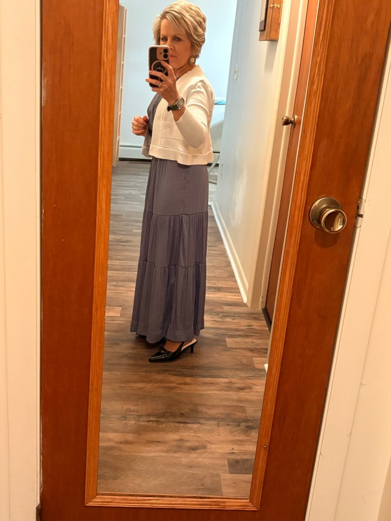 I just learned that it’s easy to hem a sweater! This cardigan was too long in the waist. I needed it two inches shorter to wear with dresses. I cut off the ribbed bottom and the extra length, then sewed it back on, going over it again with an overcast stitch. I’m so happy with the results! I got the instructions here.