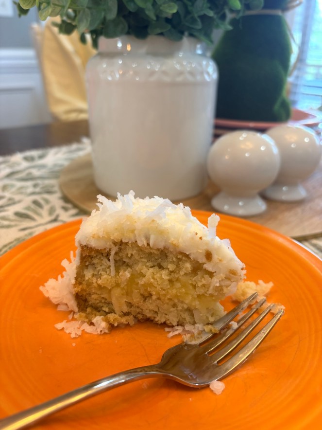 I also made a new recipe for a little 6-inch Coconut Cake. It was too late to try to make the traditional one I have made for years, so I went with the recipe on Dessert for Two. I added my lemon curd recipe in the middle of the layer. I liked the recipe for the cake. I’m not a huge fan of cream cheese icing, but it was still good! The cake batter was soft and moist.