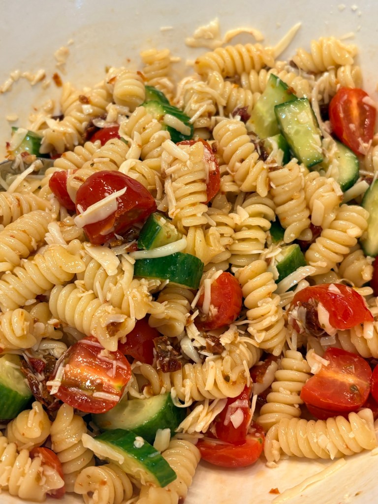 I didn’t have olives or capers and it was still delicious. I added in diced cucumbers. I also used shredded Mozzarella instead of cubed. The dressing made it taste light and almost like summer!
