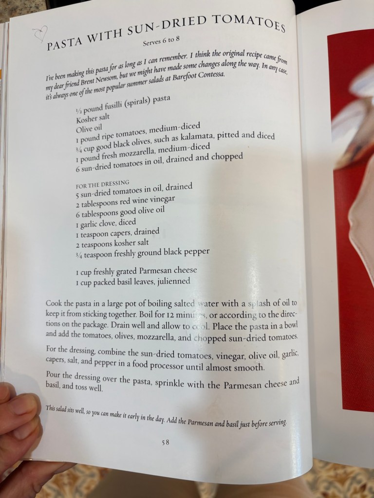 Recently I was trying to think of what to fix for lunch and I opened one of my treasured Barefoot Contessa Cookbooks and found a recipe for a cold pasta salad. It combines some of my favorite flavors – sun-dried tomatoes and Mozzarella cheese. Though I didn’t have every ingredient that was listed, I knew I could improvise and make something very similar to the recipe on the page. I love her recipes and knew it would be delicious.