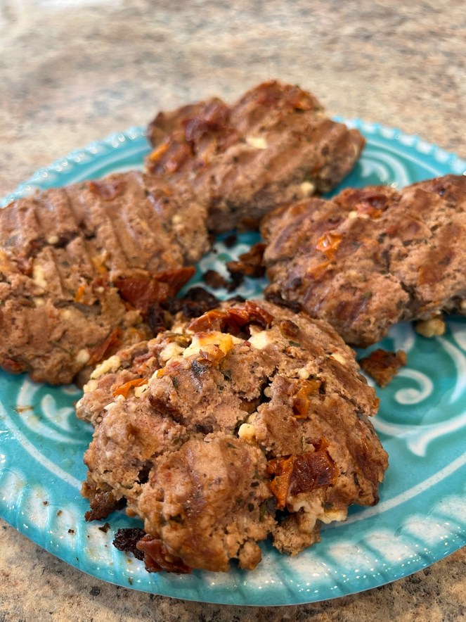 I grilled these on my Ninja grill pan and it seared them up and turned the tomatoes into crispy little bits. The cheese melted down a bit, too, as the burgers cooked. I’m sorry I didn’t get a picture of the burger on the bun; that just may speak for how good it was! This made four burgers. We ate two and I froze the other two for our lunch this week. So, if you follow me on Instagram, I’ll try to post a picture before I devour it!