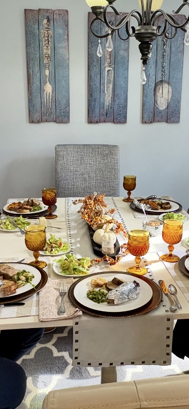 Setting the table is so much fun. It’s like adding jewelry and accessories to an outfit! I love layering the placemats, runner, chargers, plates and napkins. I went to Hobby Lobby and found chargers in the 50% off fall decor. They’re a golden brown-ish color. I plan to use these for Christmas as well. I have an idea in my head that I hope I can execute come December!