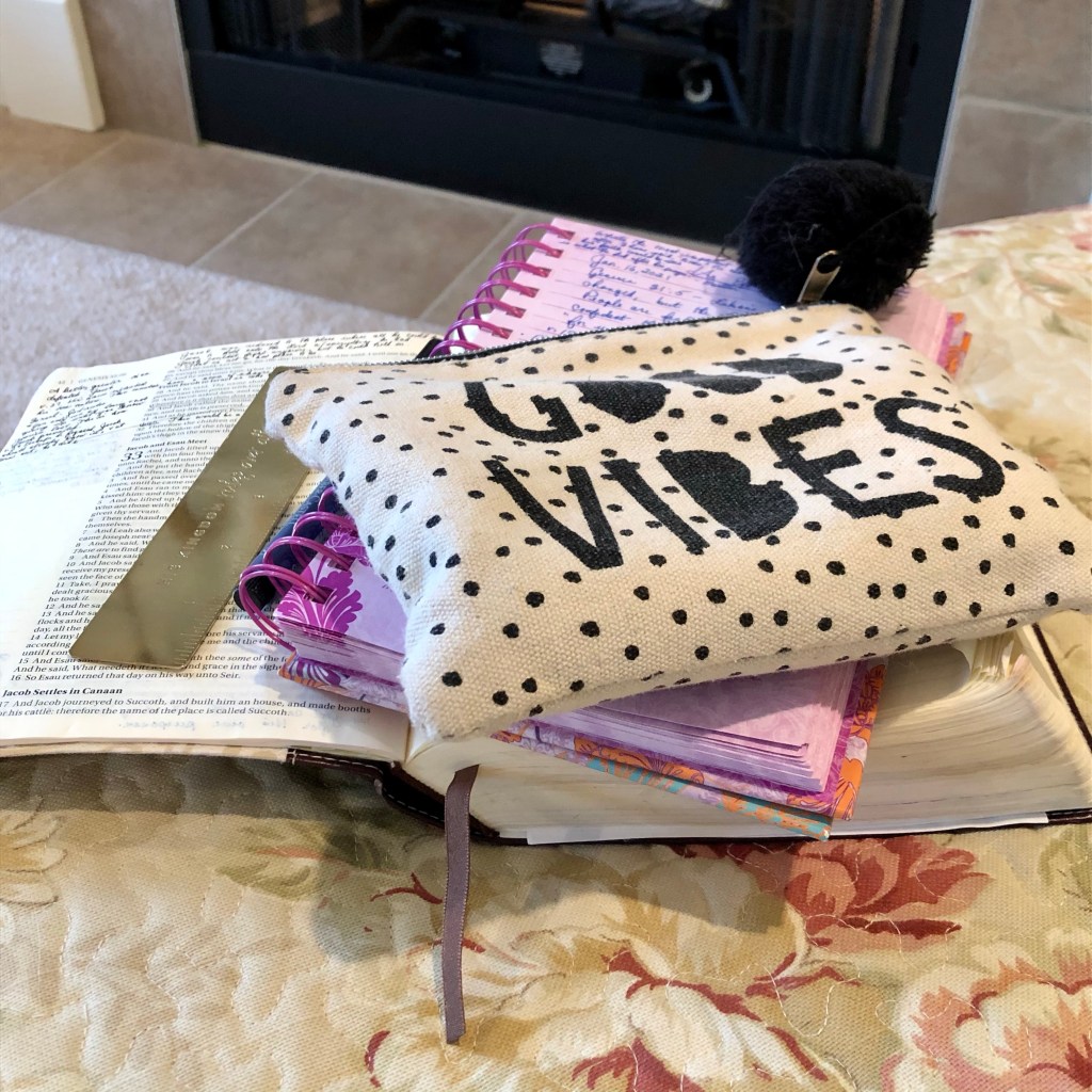 Equipment – Use good tools that will help you. I keep this little pouch filled with colored pens, highlighters, a straight edge for underlining, and a pencil. I buy the tiniest tip of a marker that will not transfer through pages. I also like buying colored ink and a pretty journal to make it more interesting.