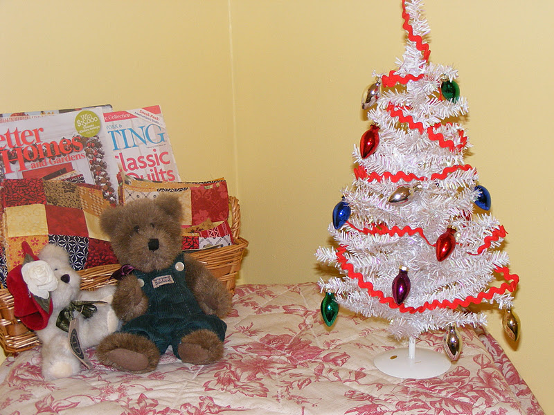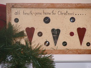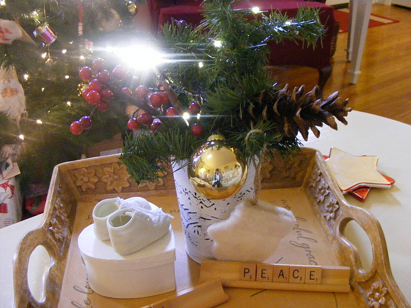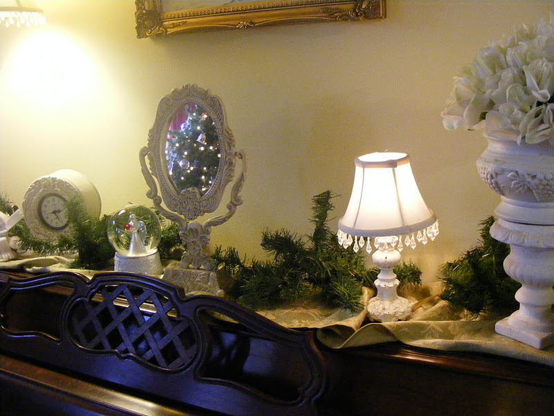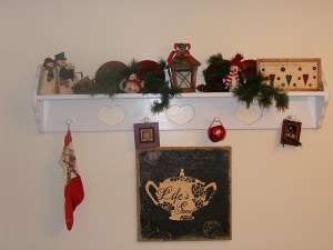 I added a small basket of ornaments on my cookbooks that I use as a platform for my lamp. Just a simple ornament tied to a lamp, doorknob, or coat hook adds a touch of Christmas! That picture has a sheet of metal in the frame so I can use it as a magnetic board. I change out the picture with the seasons, using an old Susan Branch calendar.