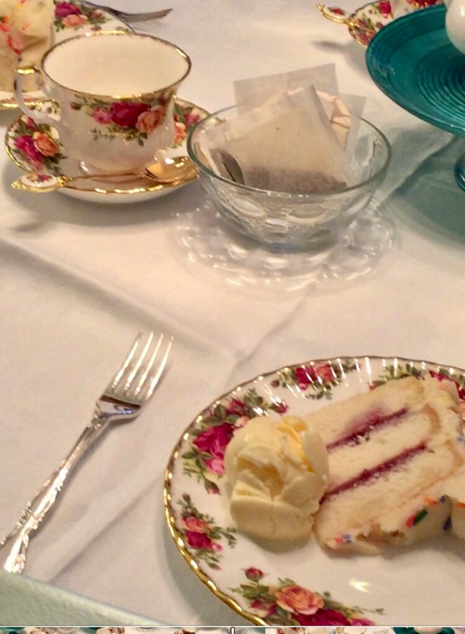 We had such a good time sipping tea, enjoying the cake and ice cream and just lingering at the table chatting. It was a fun way to spend an hour together.