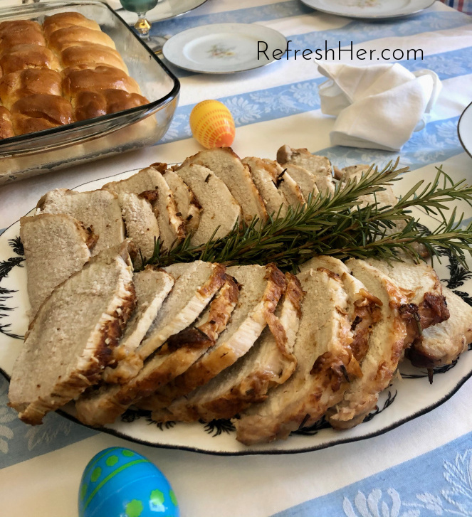 The Pork Loin is marinated overnight, giving it flavor. Then in the morning it’s seared in a pan, giving it that nice crispy edge that any meat should have! It is then roasted in the oven for a relatively short amount of time. I did this all before heading to church. Then I sliced it and put it on the platter. All I had to do after church was warm it in the oven a bit. The pan juices made a really savory gravy to pour over top!