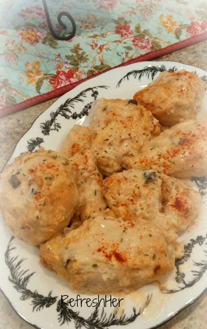 Lucky for me, years ago I found a recipe from Carnation Evaporated Milk that is called, Baked Chicken that Makes it own Gravy! No need to stand and fry chicken pieces after church – this dish is baked in the oven, topped with a Cream soup mixture and baked a little longer, yielding a lovely creamy gravy – perfect for those mashed potatoes that were cooked in the crock pot!