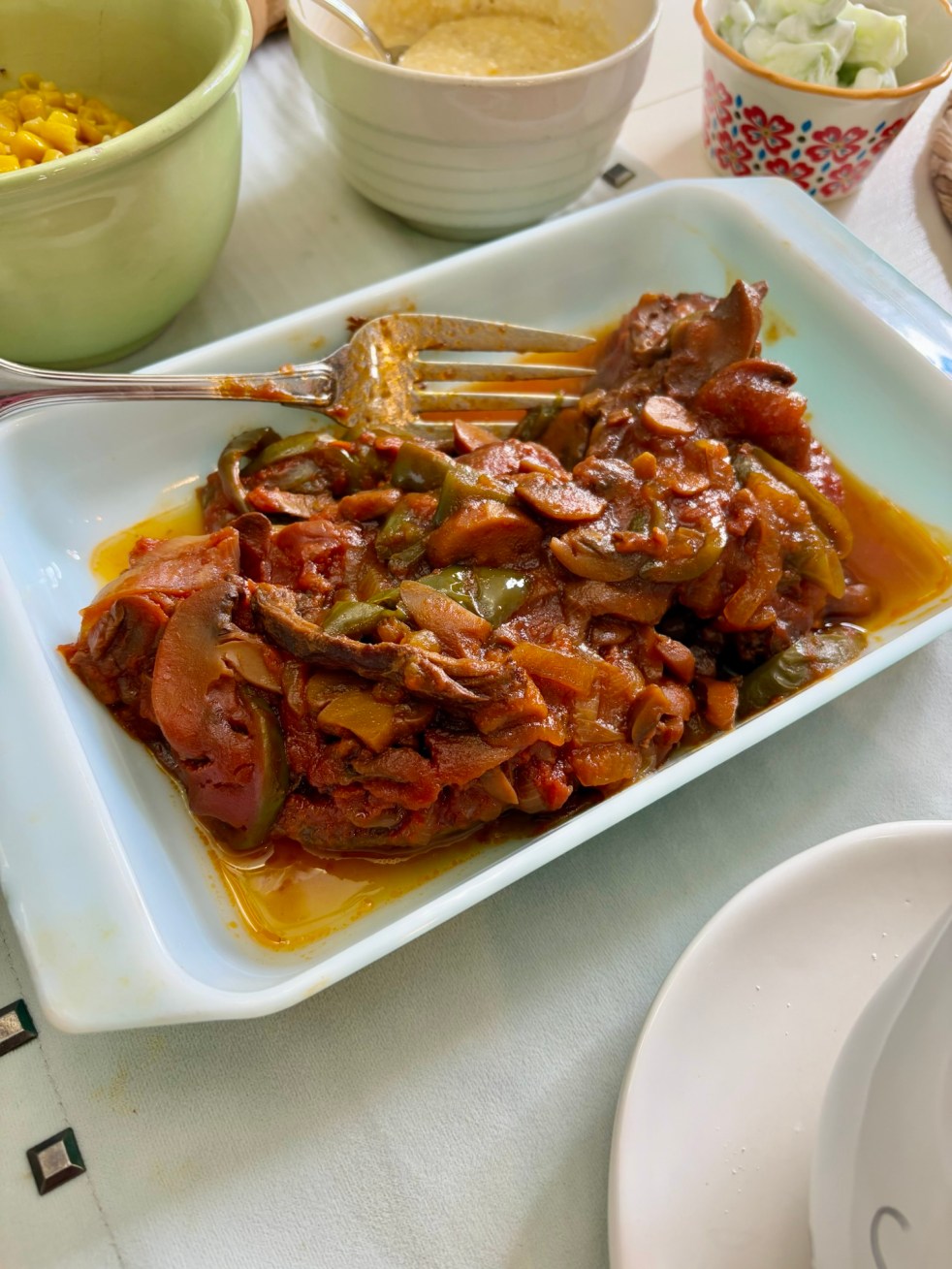 Last Saturday when I was contemplating what to make for Sunday dinner, a recipe popped into my head that I had not made in years. It’s a Baked Steak with Mushrooms. Don’t worry, if you don’t like mushrooms, you don’t have to add them. Also, rather than baking this, I put it into the crock pot. I was worried that the piece of steak I had would be a little tough, and the slow cooker would help to make it tender…oh my, did it ever!!