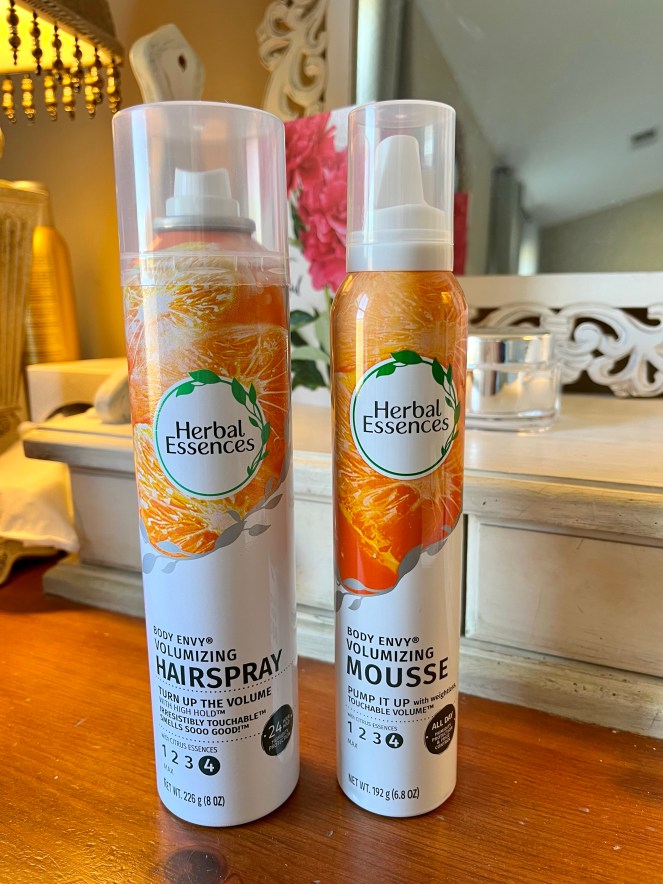 The next two items are new hair products I recently picked up after Whitney told me about them. It’s great when you daughters give good suggestions, isn’t it?! I have thick hair that can lay flat without some kind of volumizing help! Herbal Essence has two products – a mousse and a hairspray that give volume.