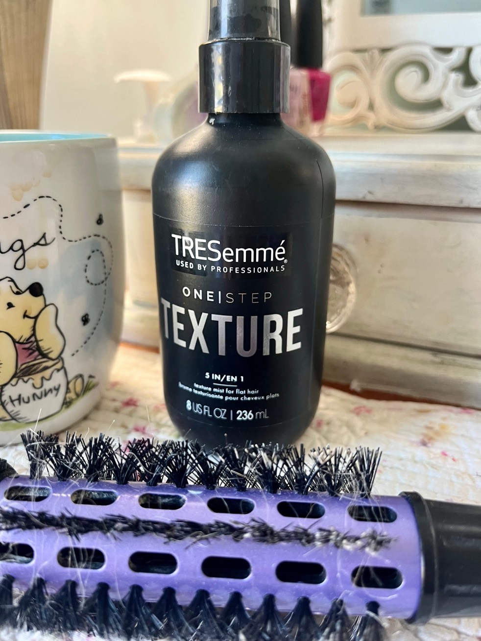 The hair spray isn’t sticky, but holds things in place after I style it.
