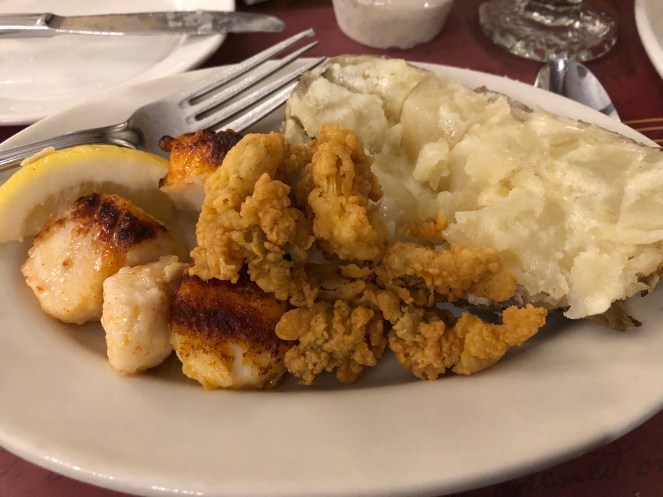 We flew into Manchester, New Hampshire, so our host took us to dinner there. We went to a seafood restaurant called, The Puritan. It was packed…on a Wednesday night and quickly found out why! The clam and oyster platter we shared was the BEST we’ve ever had anywhere! I’m not normally a fan of clams, but theirs were really good. The clams were tender and the breading had a slightly sweet taste.