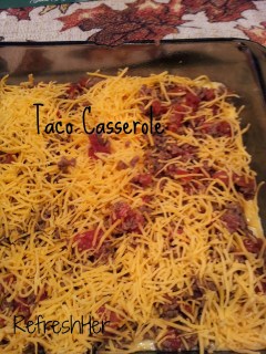 Preheat oven to 350 degrees. mix all ingredients, minus the cheese, together and pour into a greased baking dish. After the casserole has baked for 45 minutes, or is set in the middle and golden brown, sprinkle with cheddar and put it back in the oven. Let the cheese melt, take the casserole out and enjoy.