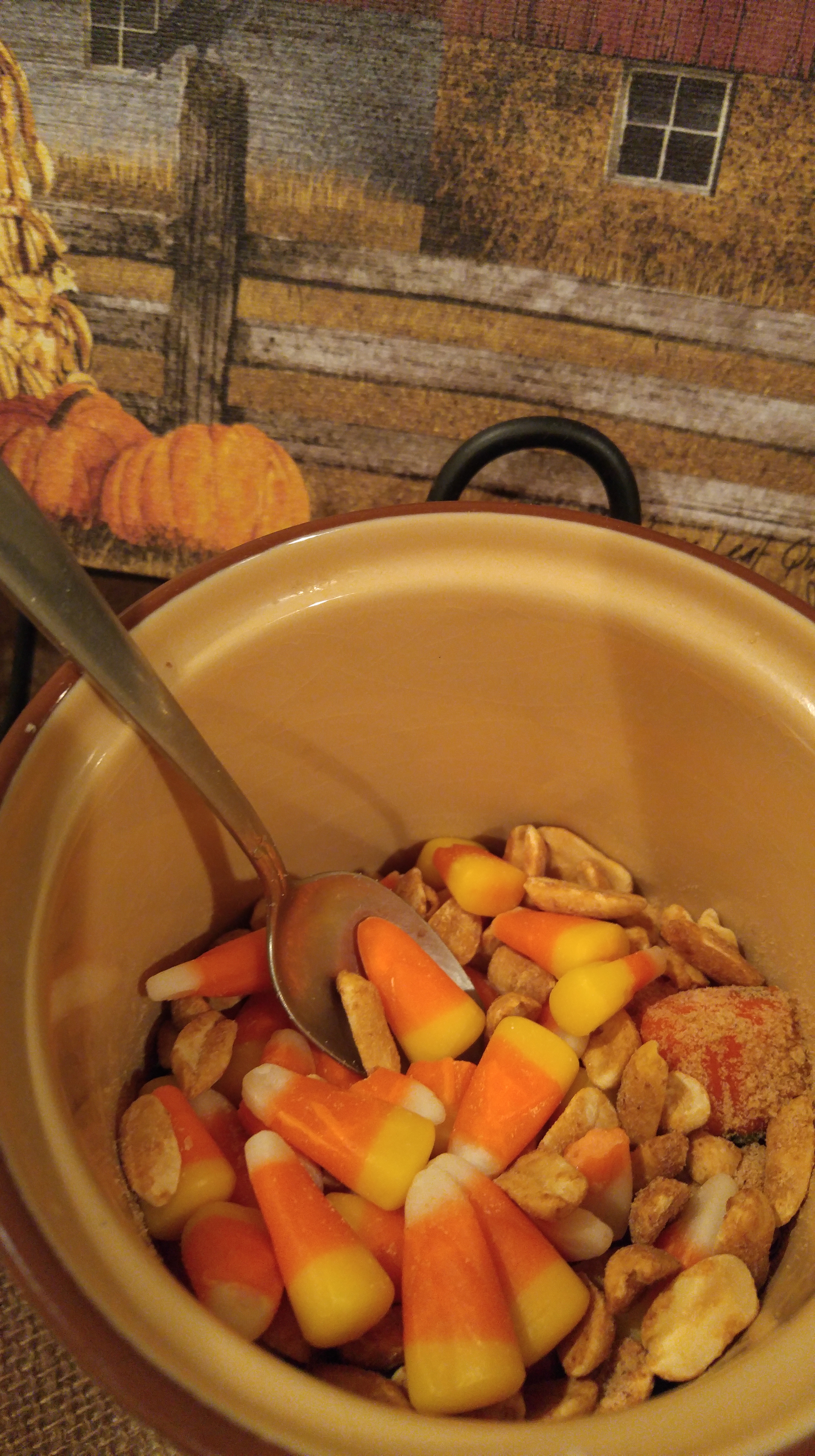 1.  Candy corn and salted peanuts.  Mix half of each in a dish, stick in a spoon and you’re done!  You won’t believe how delicious this is!  I’m not really a candy corn fan, but mixed with peanuts, it’s just the right amount of sweetness!  Grab a bag of candy corn on sale in the post-Halloween candy deals right now!