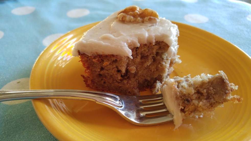 When you make the icing for this cake, if you find that the butter and bananas look like they’re curdled in your mixing bowl, and you wonder if they’ll really mix and be smooth, don’t lose heart – just keep adding the powdered sugar and it will come together just fine.