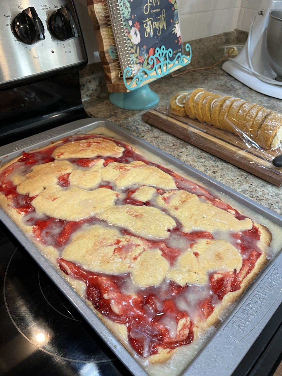 Last week our small group had a fellowship dinner. We decided the theme would be Breakfast for supper. A couple of our dear friends from out of town were going to be here to join us and she wanted to make something to contribute to the meal. Her recipe was a hit with everyone! Cherry Coffee Cake was her recipe, and it tastes like a cross between a pastry and a cake. You could substitute another fruit topping, but I’m telling you that the cherry was so delicious! She was sweet enough to share her recipe with me! Thanks, Ellen!