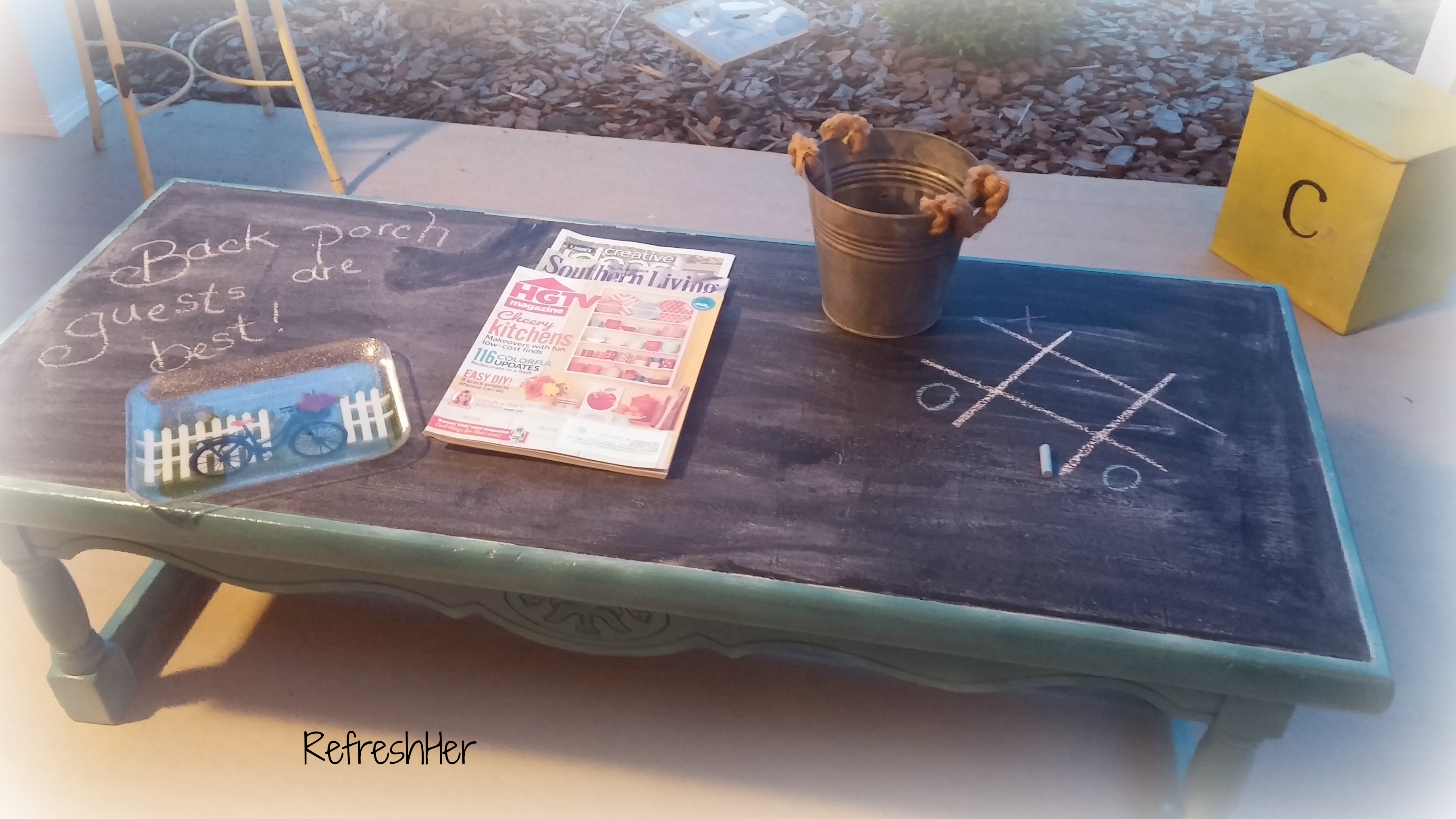 I LOVE painted furniture, so I knew I was going to paint the table, but other than that, I really didn’t have a plan. Enter Pinterest. I found an idea there to paint the top of the table with chalkboard paint! Genius! Since it’s going to be outside, it would be a perfect finish for it! How fun to let children draw or play tic tac toe on it!