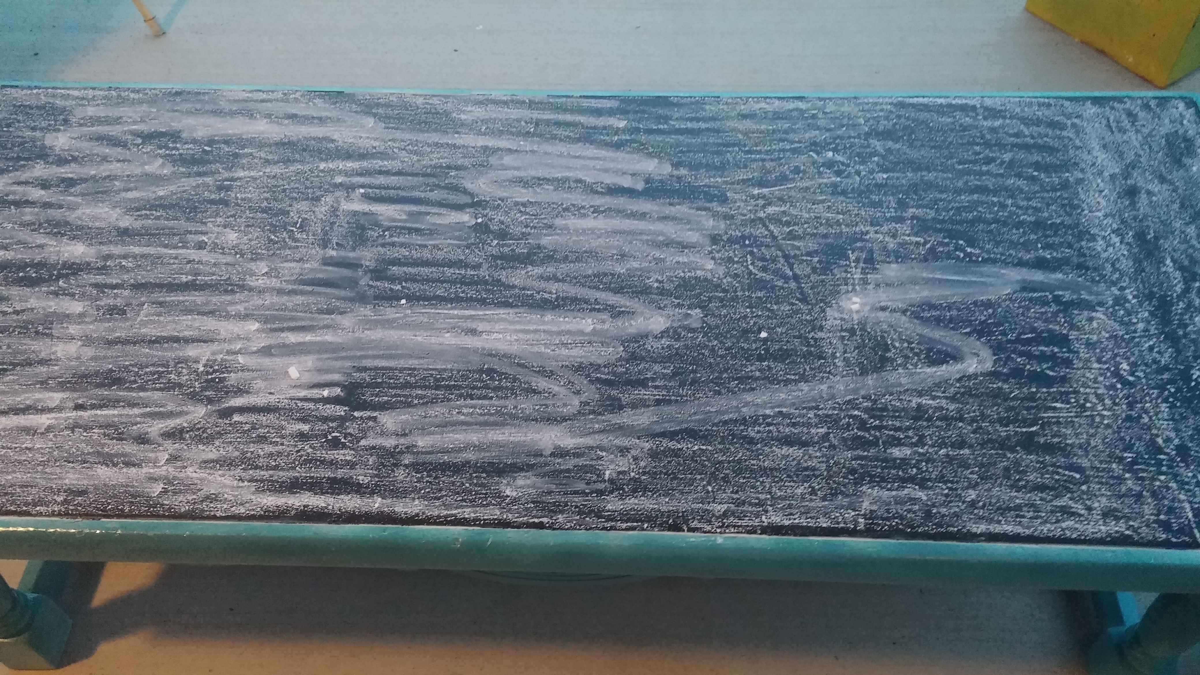 5. The next step is to season the chalkboard after the paint has dried sufficiently. You cover the whole top with chalk, then wipe it off. This is crucial for the board to be usable.Here’s what it looks like to “season” the board…