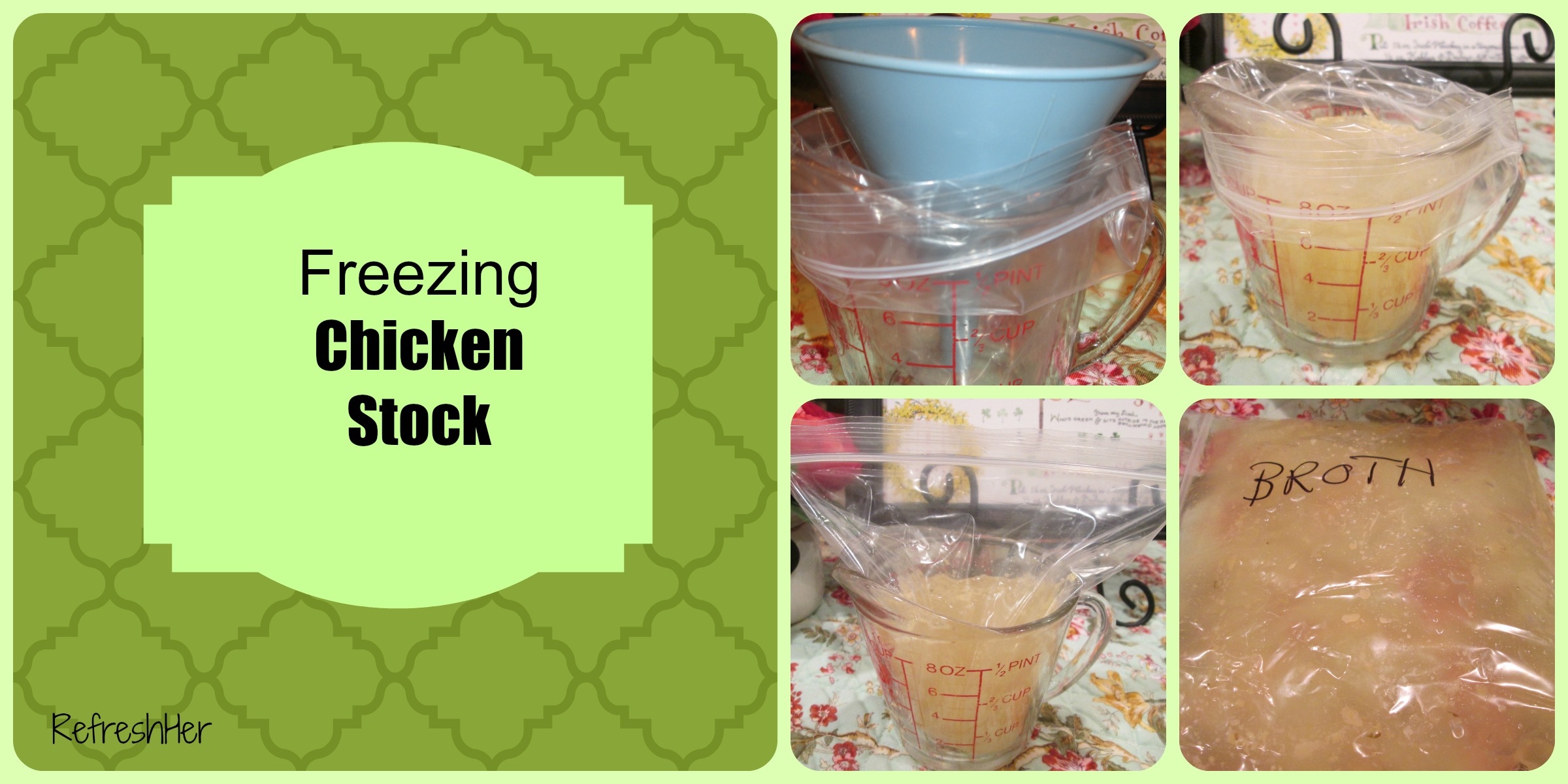 I place a ziplock back into a one cup measuring cup and then using a funnel, I ladle in the stock. After zipping the bag shut, I lay it flat and place the small bags into a gallon size bag just in case anything leaks. I take out about three cups at a time to thaw and place in a mason jar to keep in the refrigerator so it will be ready to use.