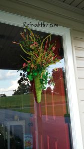 I got the green basket for $5 when we were on vacation in May and tucked it away, waiting until after the July 4th wreath was taken down to hang it. I purchased flowers when they were 50% off at Hobby Lobby and put the arrangement inside. I should have shut the inside door so you could see it better, but trust me, the coral door really makes the green pop!