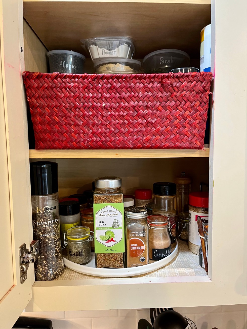 This weekend I had a couple hours when my love for organizing and my love for cooking collided. It was a needed collision! My spice cabinet that had been in good order at one time, had sadly gotten out of hand. It made my cooking more difficult, and I even found that I sighed inwardly any time I needed to search for a spice.