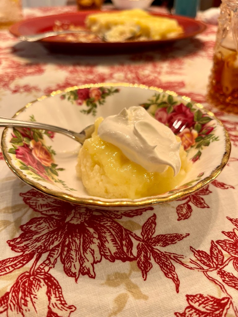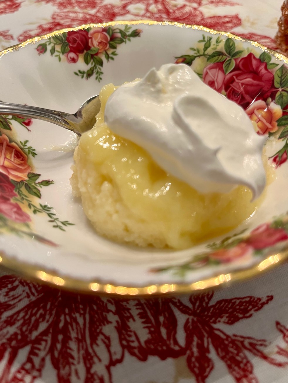 1/3 Cup Butter, softened 1 cup sugar, divided 2 eggs, separated 2 Tbs. lemon juice 1 Tbs. grated lemon rind 1/3 cup flour 1 cup milk Cream butter and 3/4 cup sugar until light and fluffy. Blend in egg yolks, lemon juice and rind. Add flour; mix well. Stir in milk. Beat egg whites until soft peaks form. Gradually add remaining sugar, beating until stiff peaks form. Fold into batter; pour into 8 6 oz. custard cups. Set custard cups in baking pan; pour in boiling water to 1/2-inch depth. Bake at 350 degrees, 35-40 minutes. Remove from water; cool 10 minutes. Invert on dessert dishes. Makes 8 servings. To make in a 1-quart casserole dish – Prepare recipe as directed. Pour batter into dish. Place into a pan larger than your dish and pour 1/2 inch boiling water into large pan. Bake 40-45 minutes. Cool 20 minutes. Invert onto serving plate.