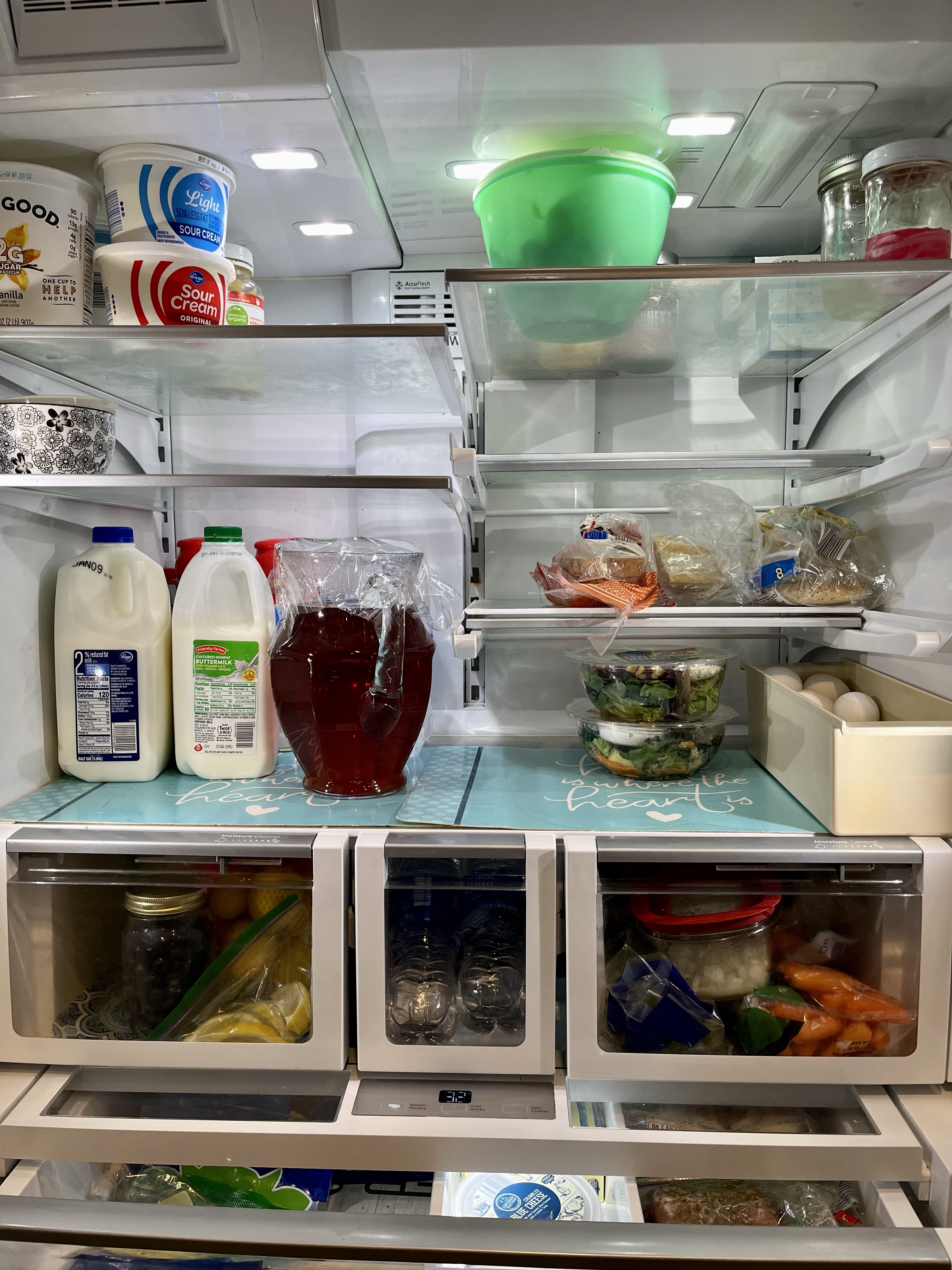 I like using vinyl placemats in my fridge because it makes it easy to wash. I plunge them into the hot, soapy water, then dry them and put them back in their spot! You’ll notice the turquoise ones in the picture below.