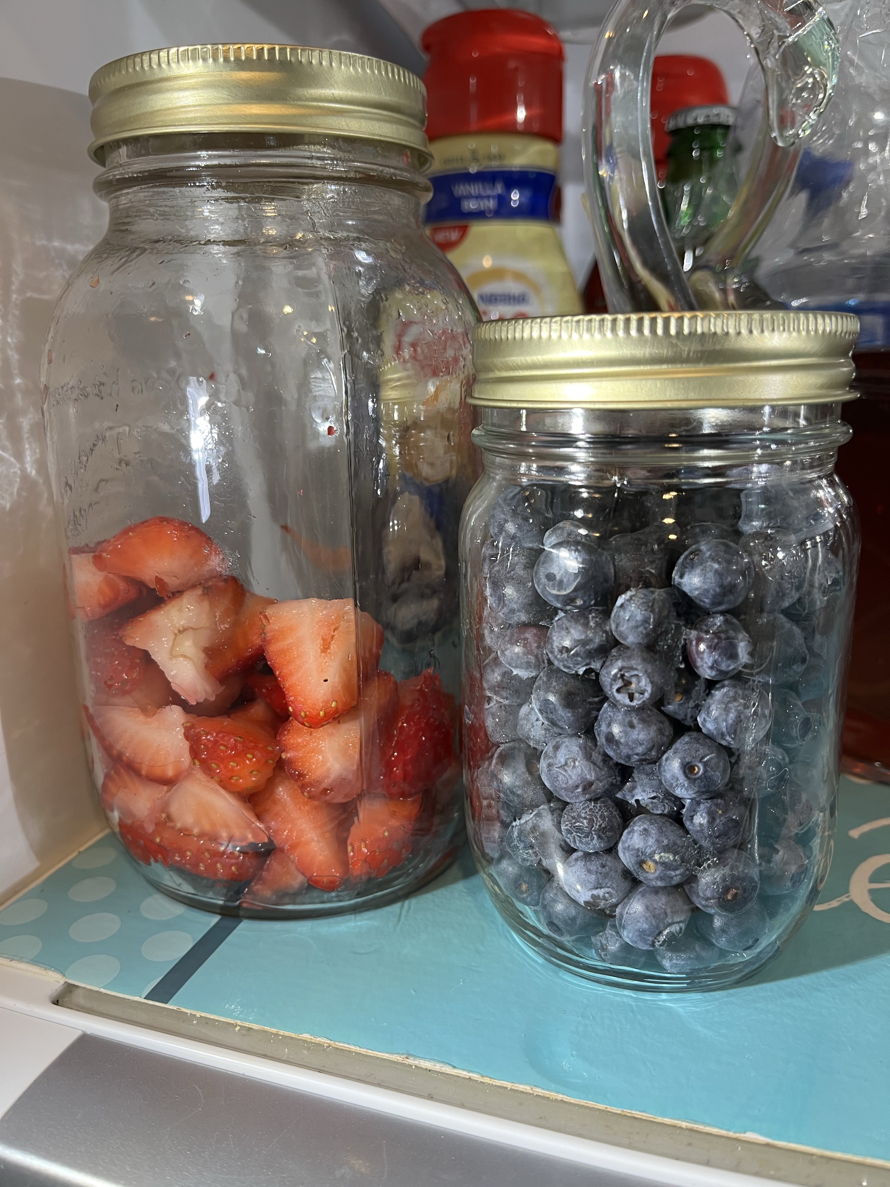 I like putting my blueberries and strawberries into Mason jars (after the berries have been washed). They stay fresh SO much longer that way! You’ll see the jar in the left drawer below. They also look pretty displayed in the fridge that way! Mason jars are also great for leftovers!