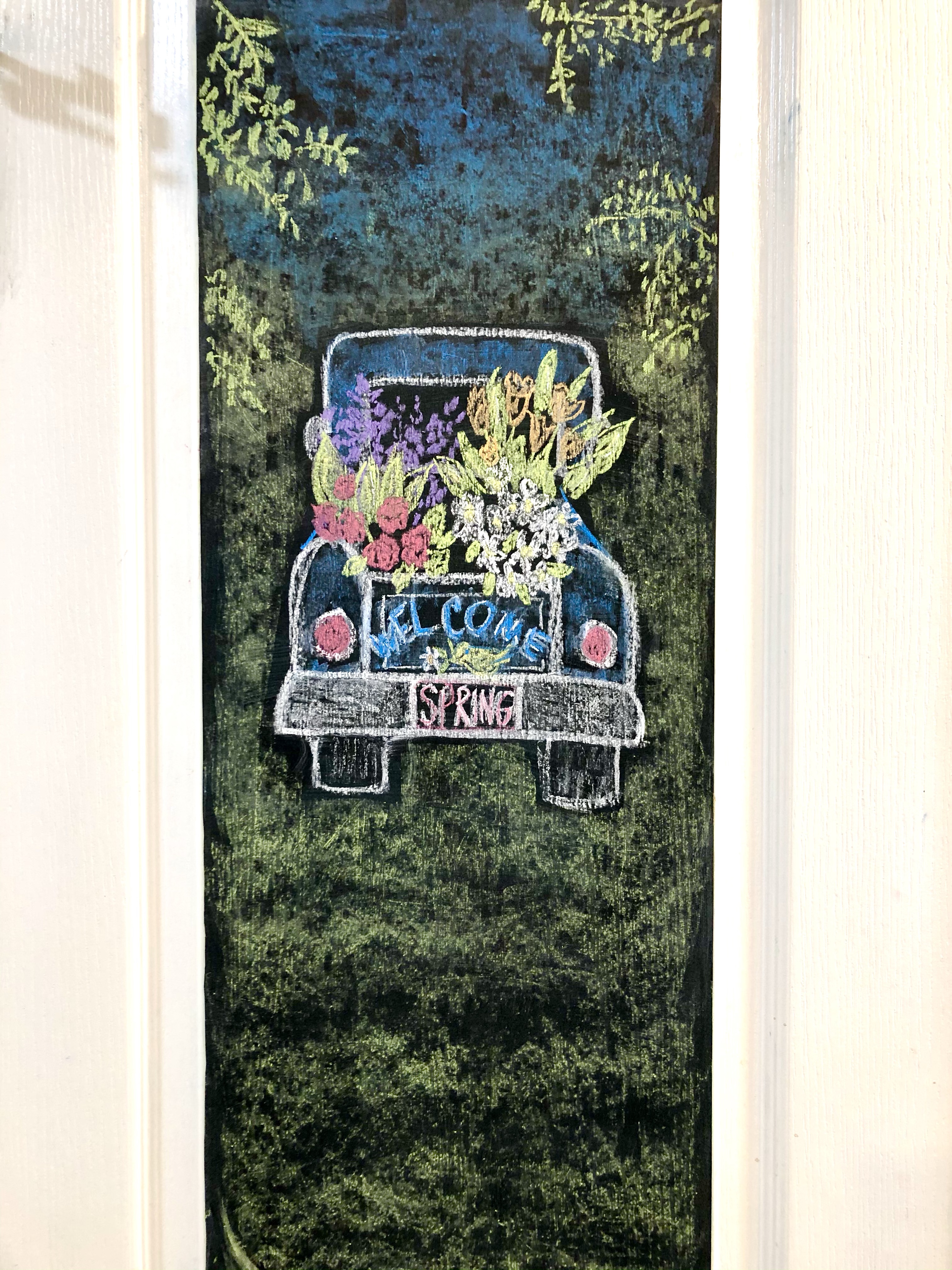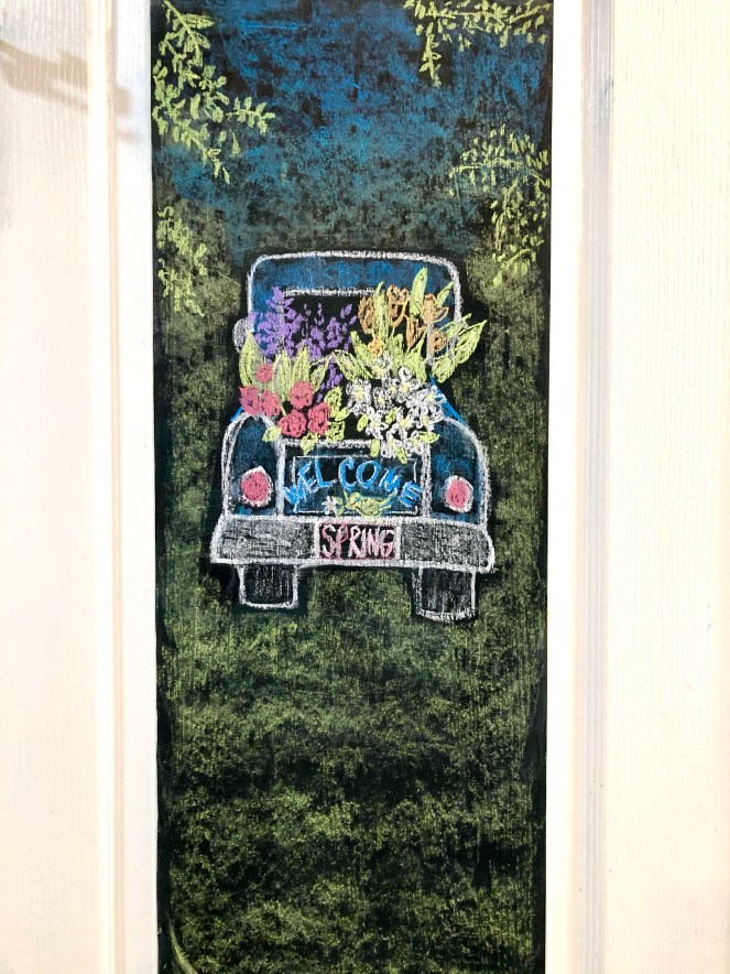 First off, I still LOVE my chalkboard vinyl that I got at Hobby Lobby. It allows my kitchen reflect the season. I did the spring pick-up truck last week when I added the spring vignettes to my downstairs. If you have a white closet pantry door, you should try adding this vinyl chalkboard. You could use it for an ongoing menu board, shopping list or for drawing or writing things like Bible verses, sayings or quotes!