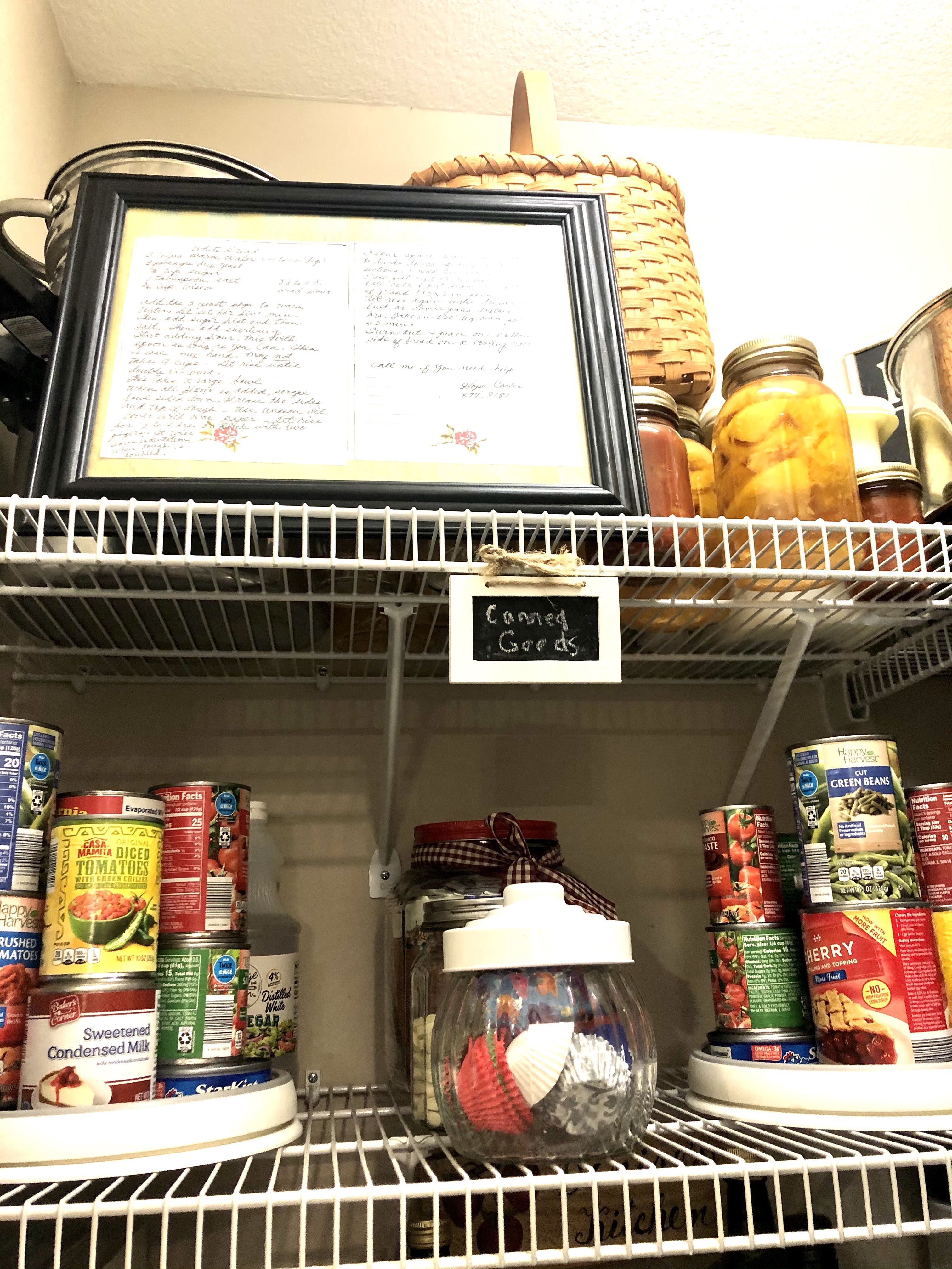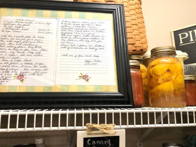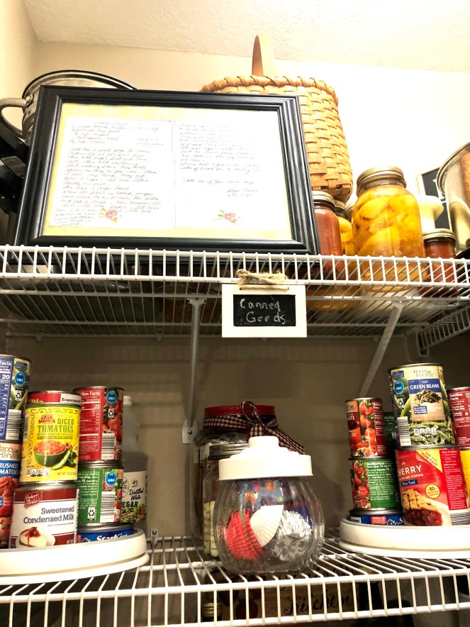 The lazy Susans are perfect for my canned goods. It’s easy to turn and see what’s available. On the top shelf are the pots and pans I don’t use that often, as well as some of my home canned fruits and vegetables. I have some of those things “hidden” by the framed recipe for bread, written in the handwriting of my dear friend, Hope, who is now in heaven. It’s a sweet reminder of her giving heart.