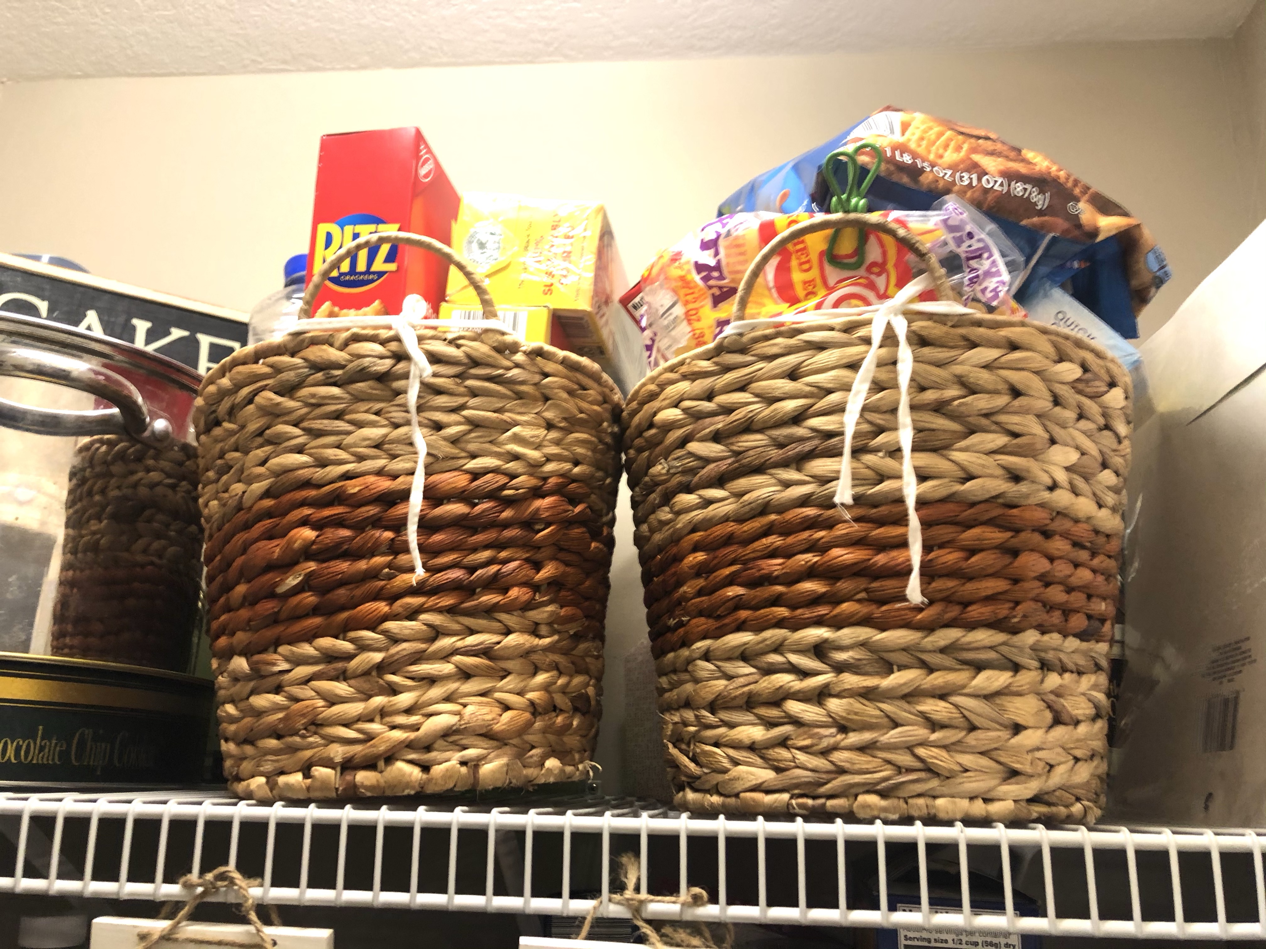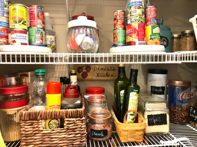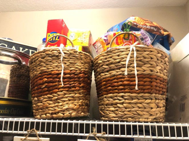 I don’t love the way these shelves look, but boxes of crackers, pastas and jars of condiments are all a little taller than my containers. These came from the Dollar Tree and have been okay, but I think I’ll be looking for deeper baskets in the near future.