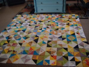 I have parents that are a quilting duo! My dad, the engineer mind in the family, cuts the fabric squares. My mom, the crafter, sews them together, then Dad cuts them again to get them perfectly square. Each square gets a heavy ironing before it’s sewn again. The picture you see here is that of the pieces being laid out to see where each one should go. After placing and replacing, they will take this up very carefully, row after row and stack it the way it needs to be sewn together. Of course after the batting and backing are put behind it there’s all the hand quilting to be done. Whoa! Many, many hours go into the making of a quilt! However, when it’s all finished it’s not only warm and cozy, it is a piece of art!