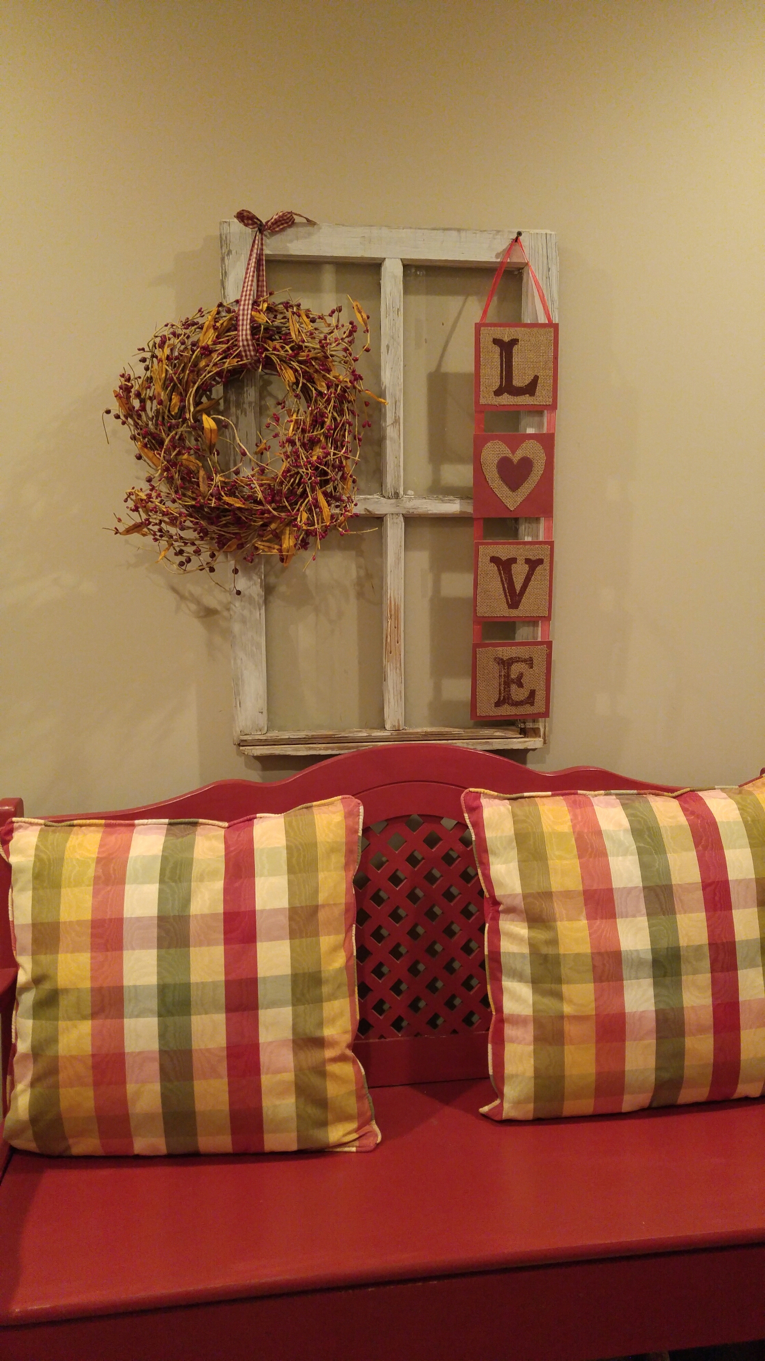My entry way just has a simple red berry and gingham wreath and a heart hanging from my old window. Red M&M’s are the chocolate treat in the dish. Kisses would be perfect, too!